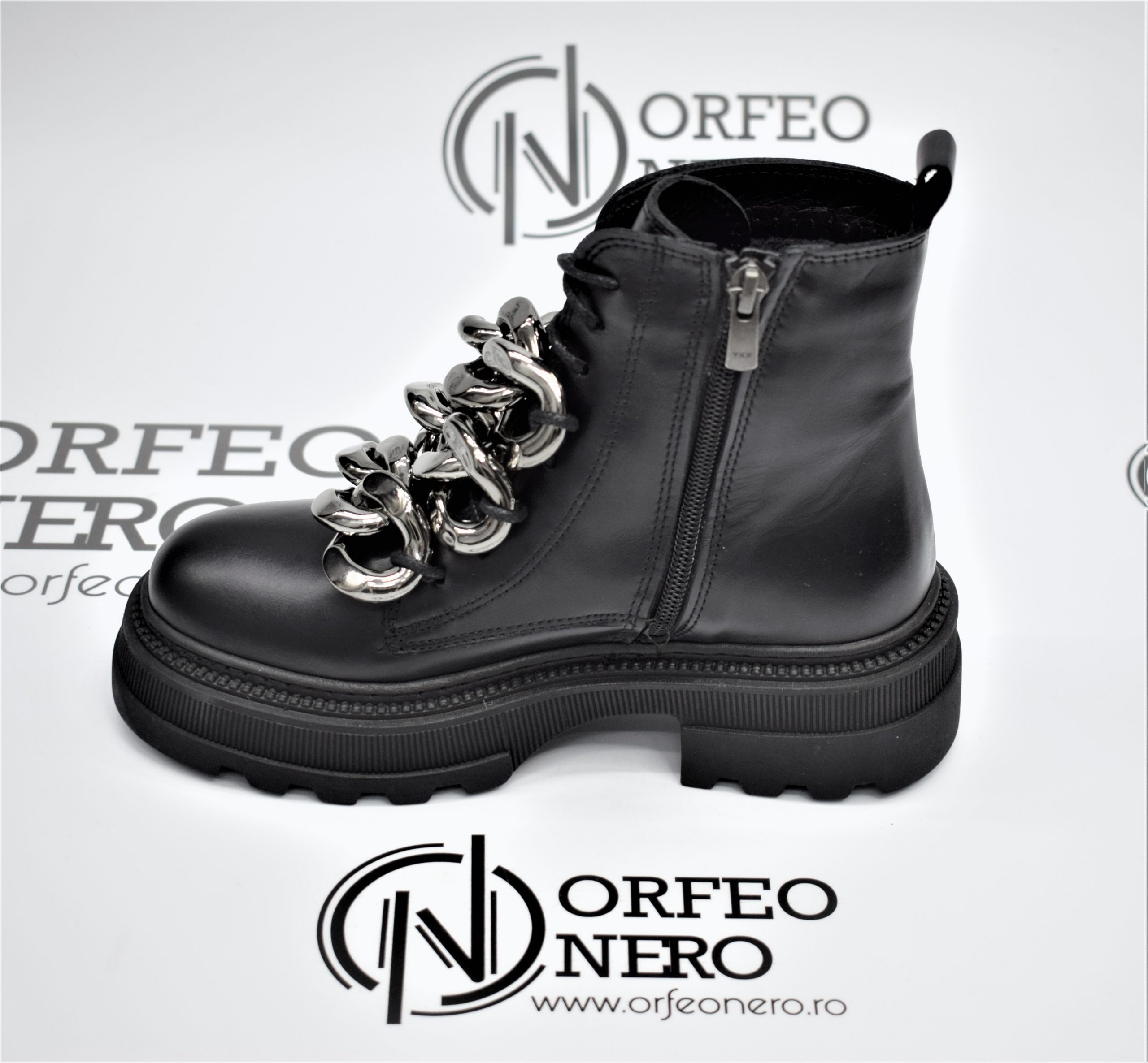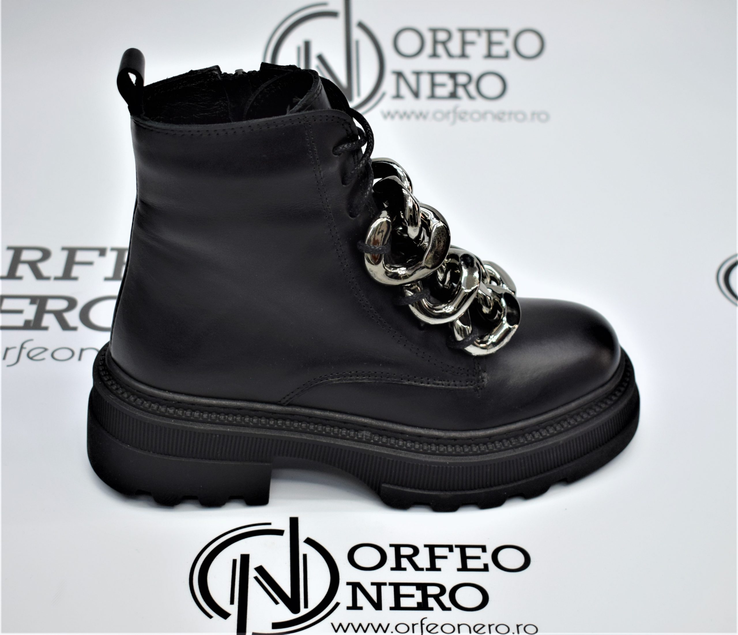 Bocanci confortabili din piele naturală, căptușiți la interior cu blaniță ,accesorizați cu lanțuri argintii.